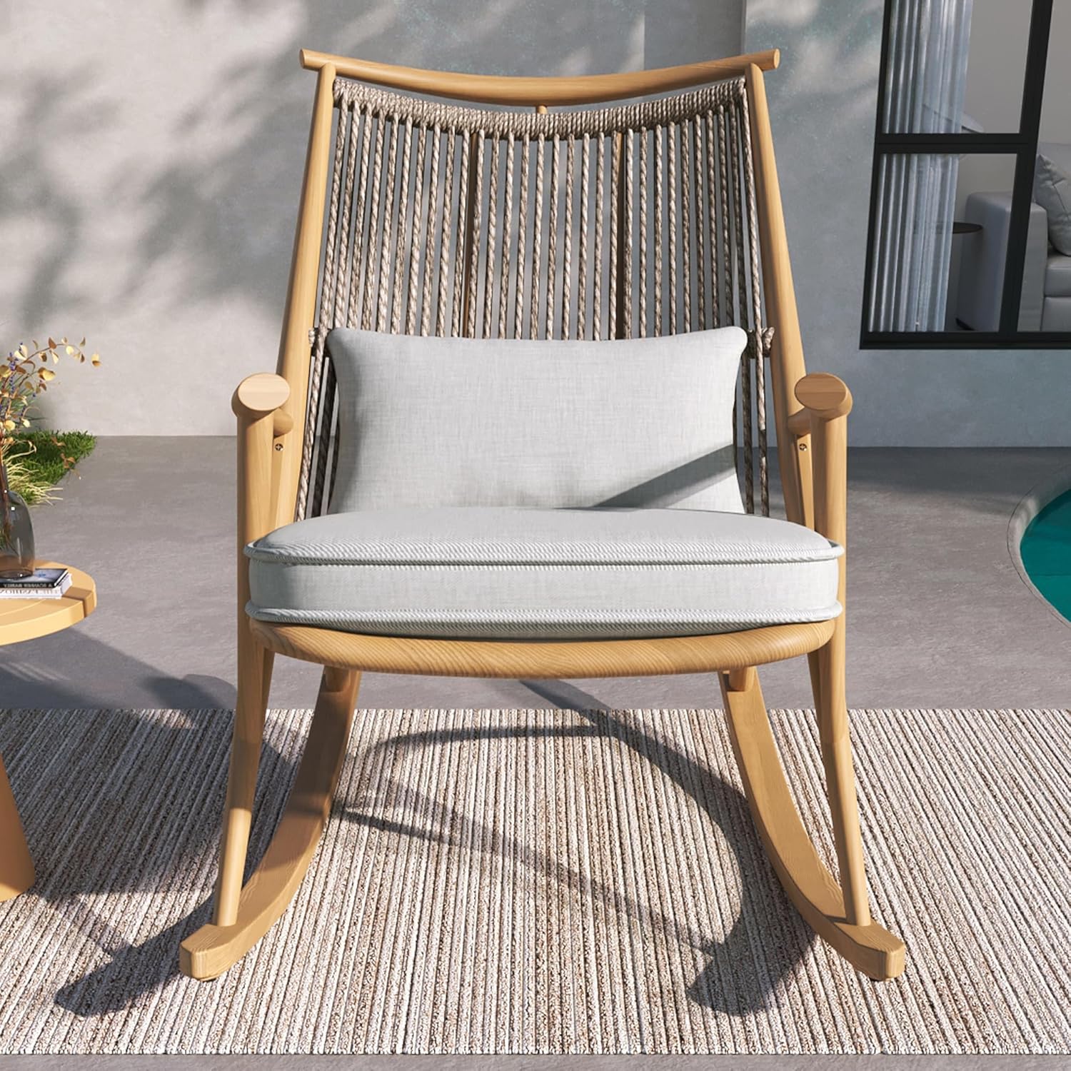 Enjoy outdoor relaxation with this elegantly crafted rocking chair. Featuring a premium iron frame with a warm maple finish, it offers rustic charm and all-weather durability. The breathable gray PE rattan backrest ensures comfort and airflow, while plush light gray cushions add softness. A smooth rocking motion and 400 lbs weight capacity make it perfect for patios, porches, or garden spaces.