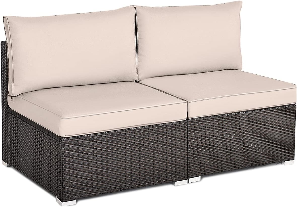 Description:Create a beautiful outdoor seating area that you have always dreamed of with this rattan sectional armless chair set. Constructed from a heavy-duty steel frame and weather resistant PE rattan wicker, equipped with 2 back cushions and 2 seat cushions, this conversation wicker sofa set is ideal to use separately or as a complement for multi-piece furniture, providing you with the most comfortable and relaxing outdoor lounging experience. It will be perfect for your garden, lawn, backyard, and poolside.Features:Powder coated steel frame and weather-resistant PE rattan for durabilityL-shaped aluminum foot pads prevent sliding and protect the floorHand-woven rattan is weather resistant, suitable for outdoor useThickened seat and back cushions provide more comfortCushion cover comes with zipper for easy cleaning2 armless chairs can be used separatelyAdded to the same style sofa set to get a larger sofa setStrong load bearing capacity of the sofa set up to 710 lbsIdeal for indoors, patio, poolside, balcony and gardenEasy to assemble under the guidance of the detailed instructionSpecifications:Color of Wicker: BrownColor of Cushion: Navy Blue/Turquoise/Red/BeigeMaterial: Steel, Rattan, Polyester Fiber, Sponge, AluminumArmless Chair Dimensions: 25.5” x 29.5” x 25.5” (L x W x H)Weight Capacity of One Chair: 355 lbsWeight Capacity of Two Chairs: 710 lbsSofa Set Weight: 42 lbsPackage include:2 x Armless Chair2 x Seat Cushion2 x Back Cushion1 x Instruction