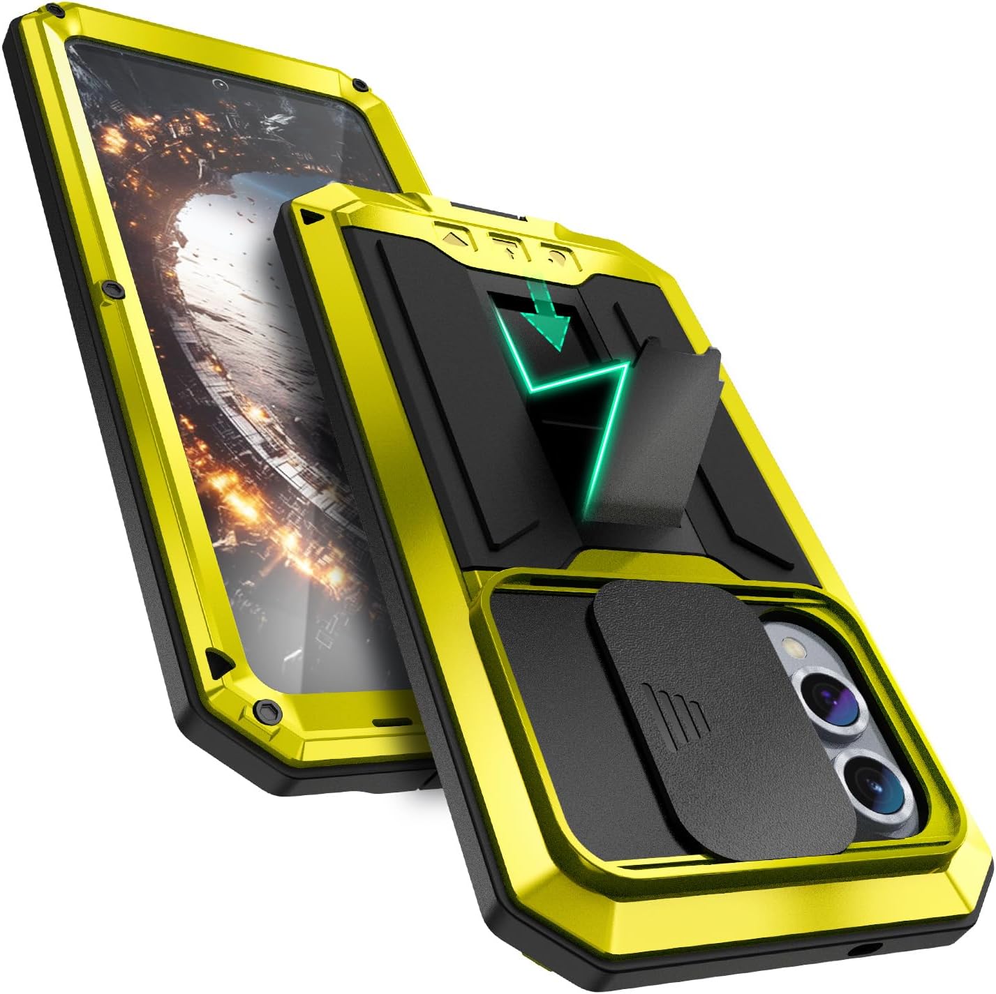Compatible with Samsung Galaxy S25 FE Metal Case with Camera Cover Stand Gorilla Glass Full Body Hybrid Military Heavy Duty Armor Silicone Rugged Phone Cover for Man Woman (Yellow)