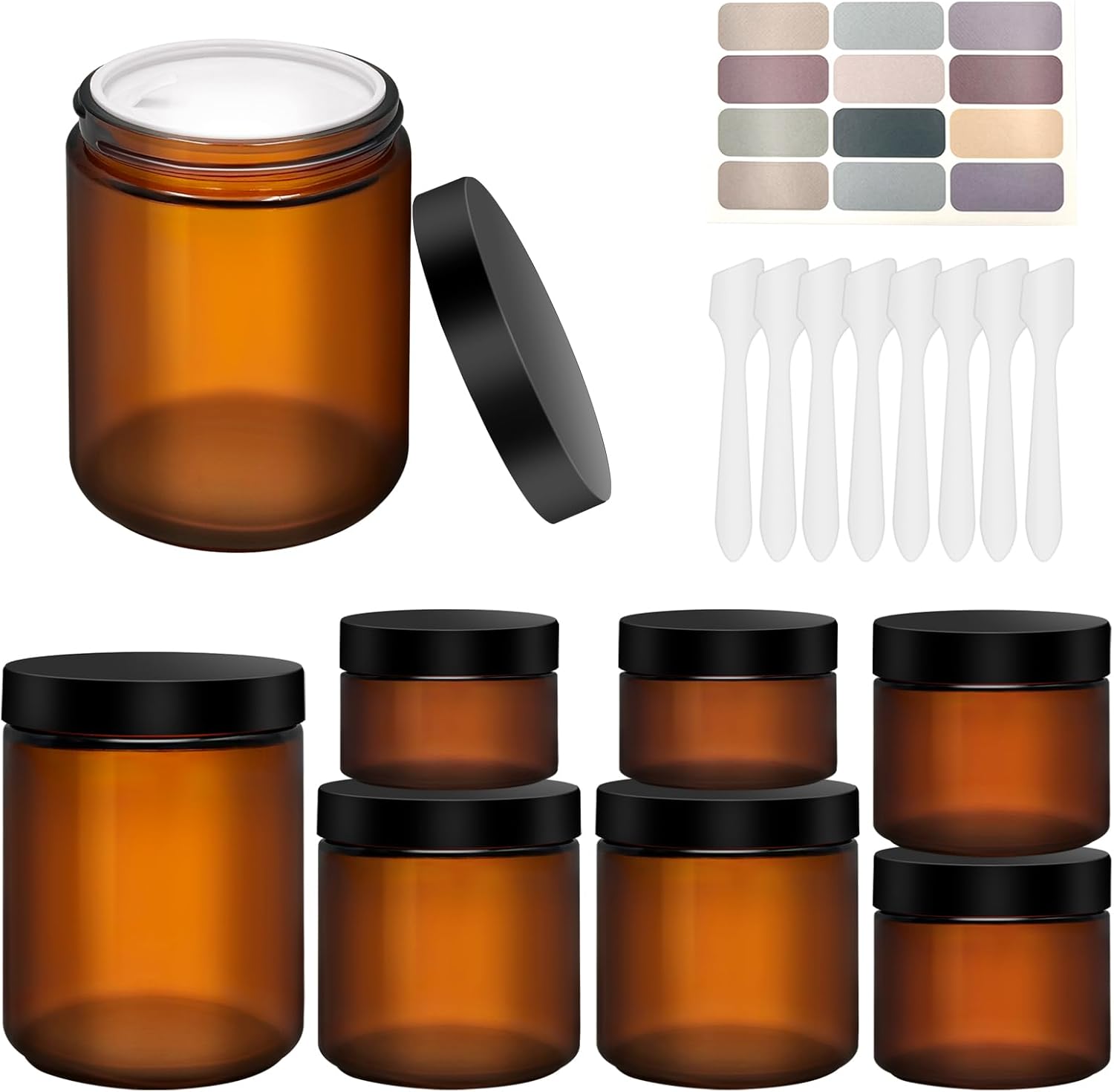[About 16-Pack Amber Glass Jars with Lids Set] This amber glass jar set includes 4 sizes (8oz*4, 4oz*4, 2oz*4, 1oz*4) for flexible storage of cosmetics, creams, and lotions. The amber glass offers superior UV protection, keeping your skincare products safe from light damage. The airtight lids with foam liners ensure no leakage during travel. With included label stickers and spatulas, you can easily organize and apply your homemade creams, DIY face masks, or essential oils. Perfect for home, salon, or travel use.