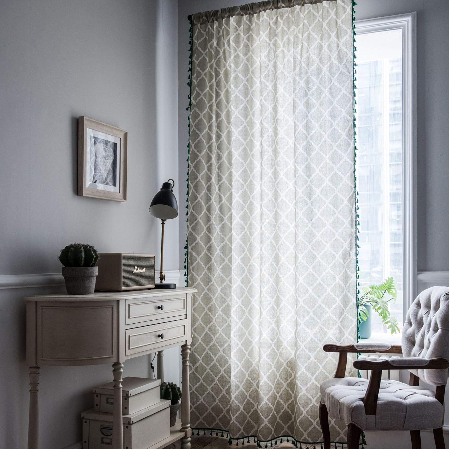 GYROHOME Yellow Lattice Curtains with White Tassels,1 Panel Rod Pocket,semi Shading uesd for Kitchen,Bedroom Living Room Floating Window(59x78inch)