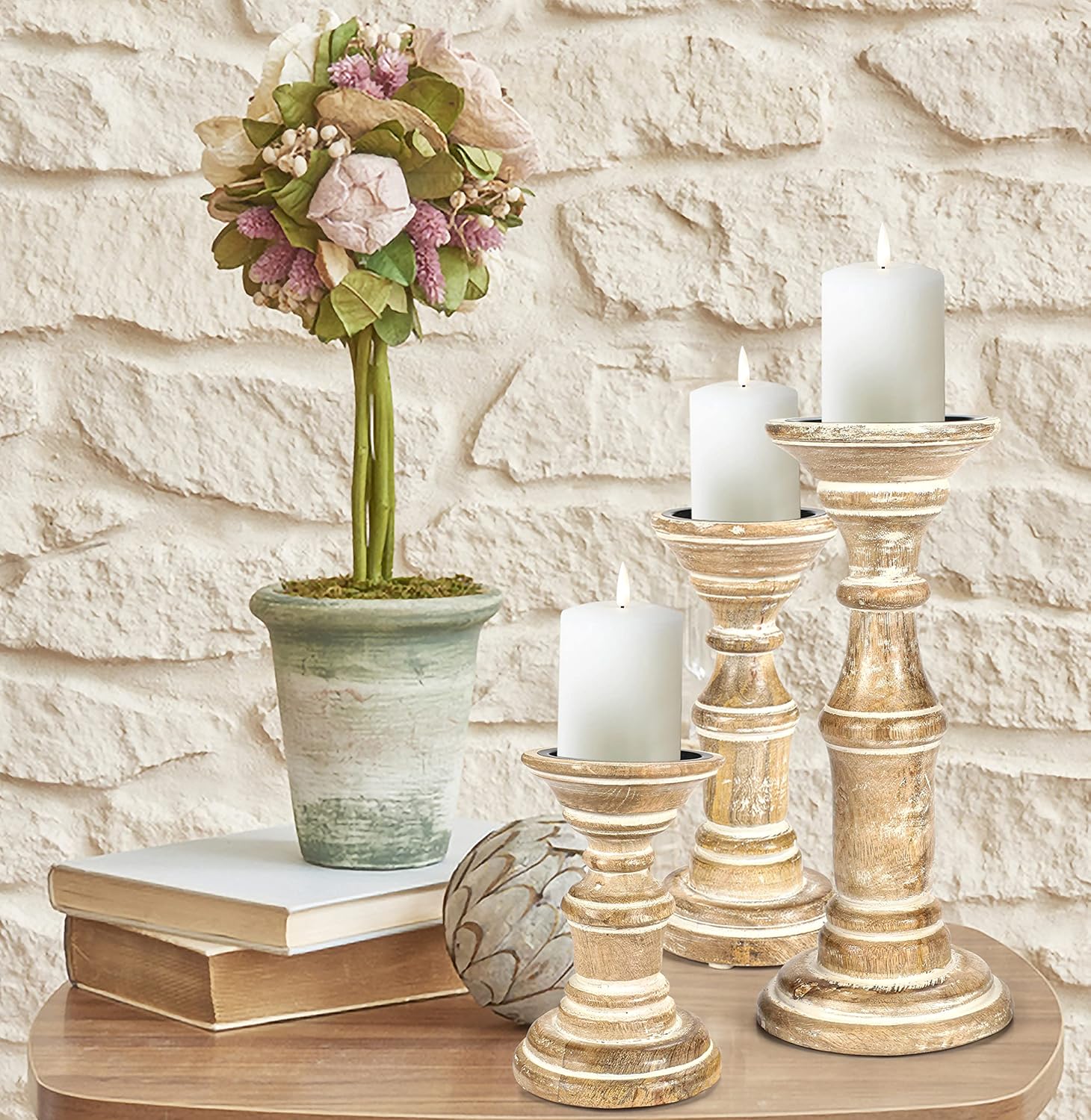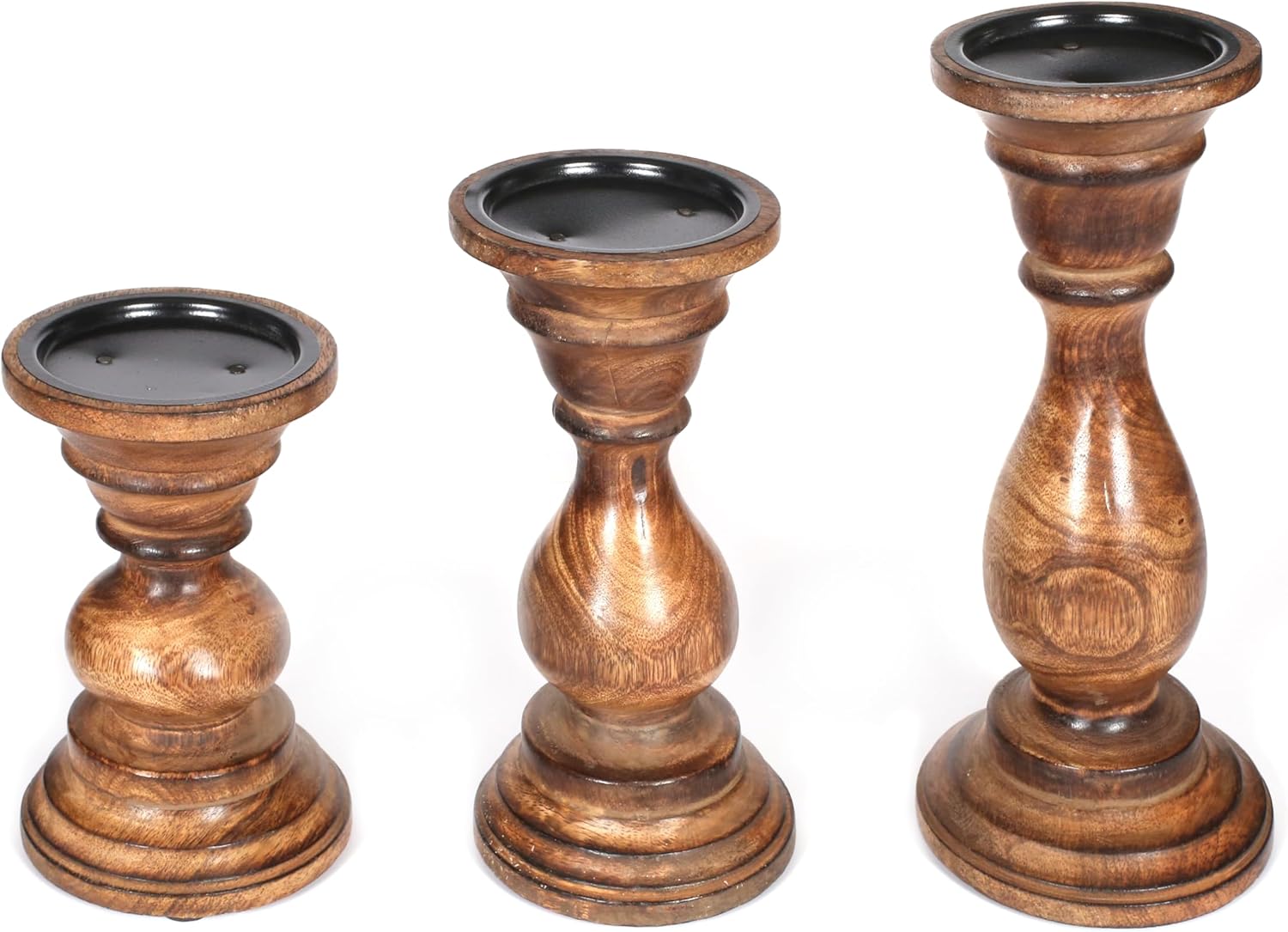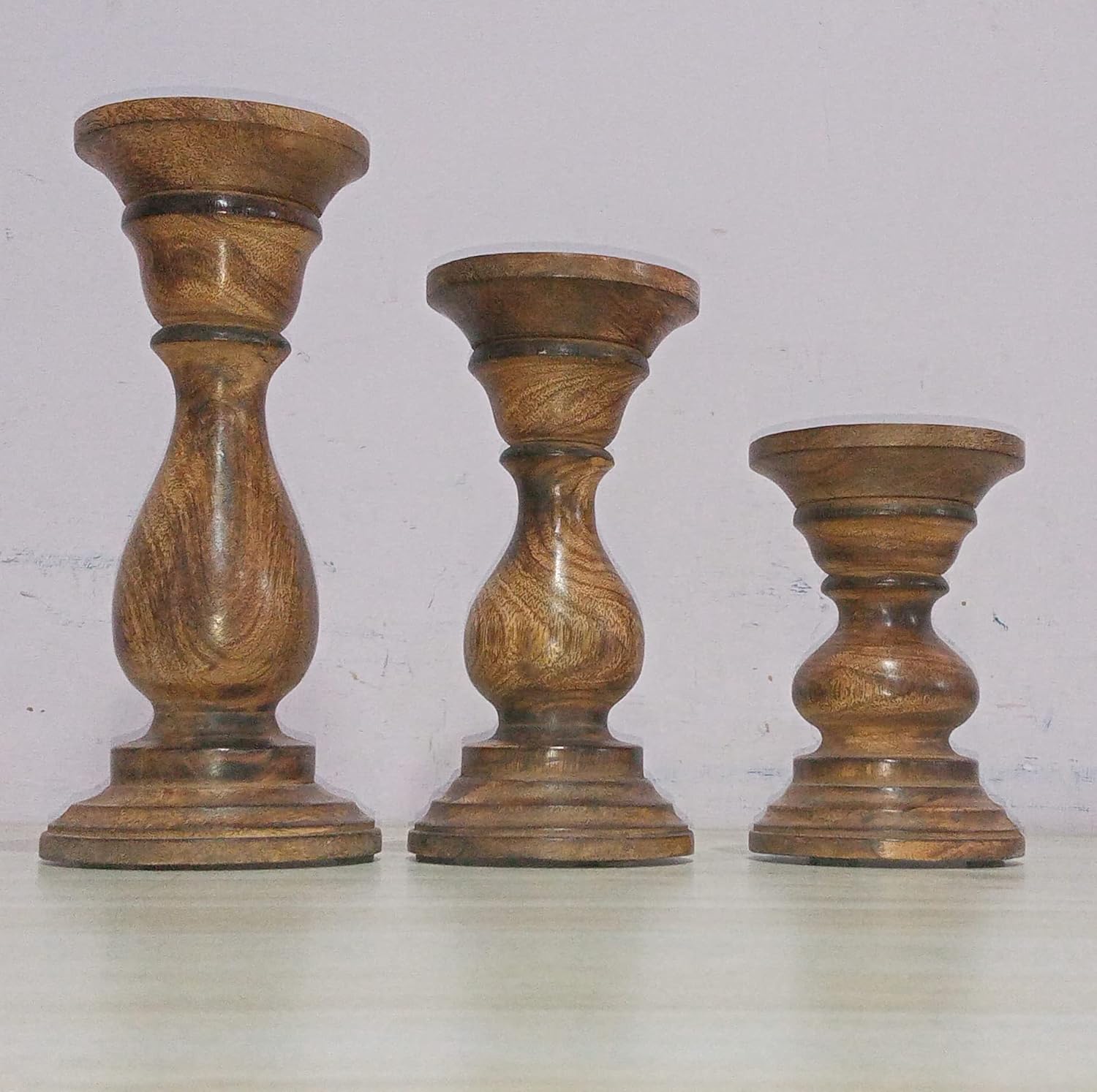 Handcrafted of sustainable gorgeously grained mango wood that has a time worn look, the set offers 2 candlestick holders. Featuring graceful designs of traditional farmhouse elegance, this set of 2 handmade wooden candlestick holders will showcase your dinner table and any occassion. Perfectly sized for candle light dinner.