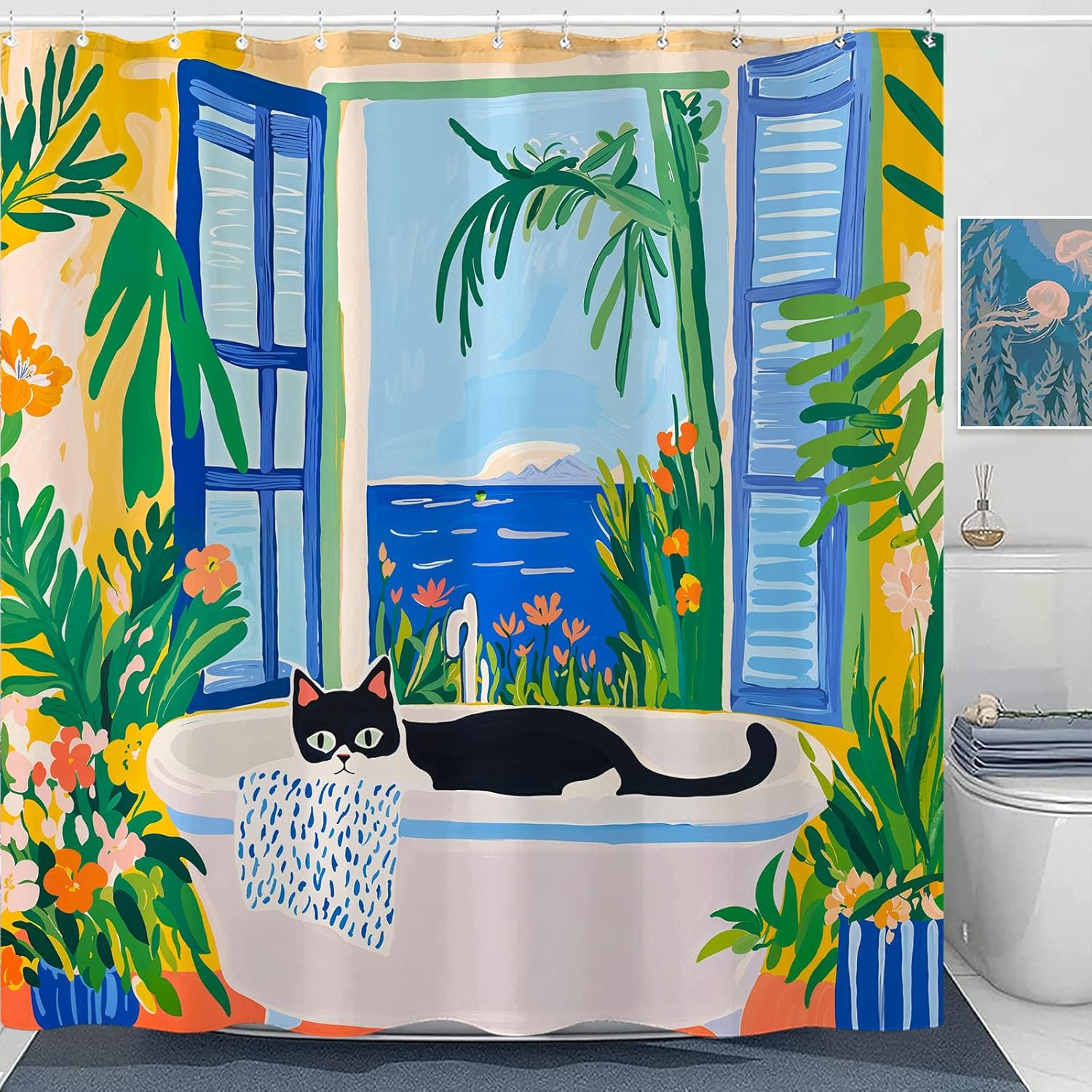 Dive into a world of fun and art with the Kanuyee Japanese Wave Cat Shower Curtain. This eye-catching curtain takes inspiration from classic Japanese Ukiyo-e art, featuring a cute tabby cat riding the famous great wave, complete with a fish on its head. Crafted from 100% durable polyester fabric, this Kanuyee curtain is designed to be water-repellent and quick-drying, offering both a functional barrier and a humorous centerpiece for your bathroom. The set includes simple plastic hooks, ensuring hassle-free installation and allowing you to instantly inject personality and art into your daily routine.