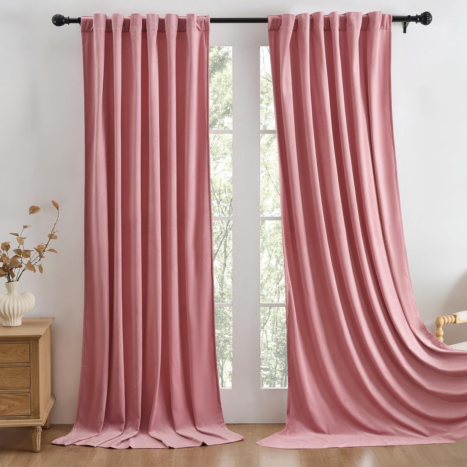 Velvet Curtains – Elegant & FunctionalDual Installation: Back Tabs & Rod Pocket.Size: 52"W x 84"L per panel (2 panels cover 104"W).Materials: Premium VelvetLuxuriously soft, heavyweight fabric in solid colors for timeless elegance. Drapes beautifully and resists fading.Opacity: Total BlackoutFilters harsh sunlight (darker hues perform best) while blocking most UV rays to protect interiors.Energy-Saving InsulationReduces heat transfer and ambient noise for year-round comfort and lower energy bills.