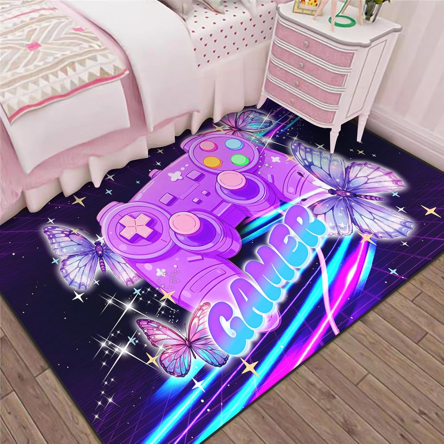 Elevate your gaming sanctuary (and every corner of your home) with our striking Game Controller Area Rug!Crafted from premium, soft-touch fabric, this cool game controller gamer rug delivers a plush, cloud-like surface—perfect for kicking back during marathon gaming sessions, or even as a cozy play mat for little ones to build blocks and cuddle with toys.Featuring cutting-edge 3D digital printing, our gaming rug showcases bold, neon-splashed game controller graphics with hyper-vibrant, eye-popping colors. The vivid splatters and glowing neon outlines pop against a deep, cosmic background, creating a dynamic, almost glowing effect. Designed as washable game room rug that stay colorfast, so your bold design stays crisp and vivid wash after wash.Tailored for gaming enthusiasts and style lovers alike, this colorful gamer gaming rug doesn’t just stun with vivid color expression—it boasts sharp, detailed controller patterns that instantly transform any space into an immersive gaming hub. Whether placed in your dedicated gaming room, bedroom, living room, apartment, or playroom, it infuses your decor with a retro-futuristic, high-energy gaming aesthetic that turns ordinary moments into epic, immersive experience
